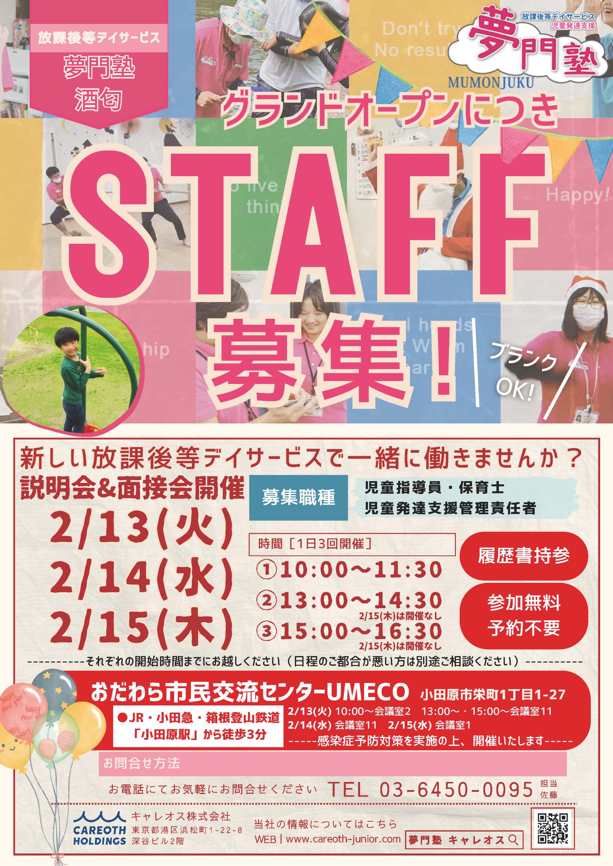 放課後等デイサービス夢門塾 酒匂 お仕事説明会・面接会を開催します。予約不要、参加無料です。お気軽にご参加ください。
