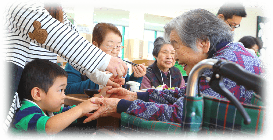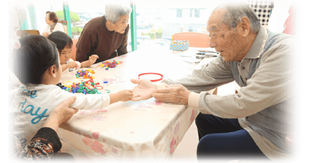 ひと昔前の日本は地域コミュニティの中で協力し合いながら、おおらかで豊かな子育てをしていました。きらめき保育園では同法人事業にある介護福祉施設と隣接しており園児と高齢の方々と関わり合える機会を大切にしています。(例:高齢者とのお茶会など)