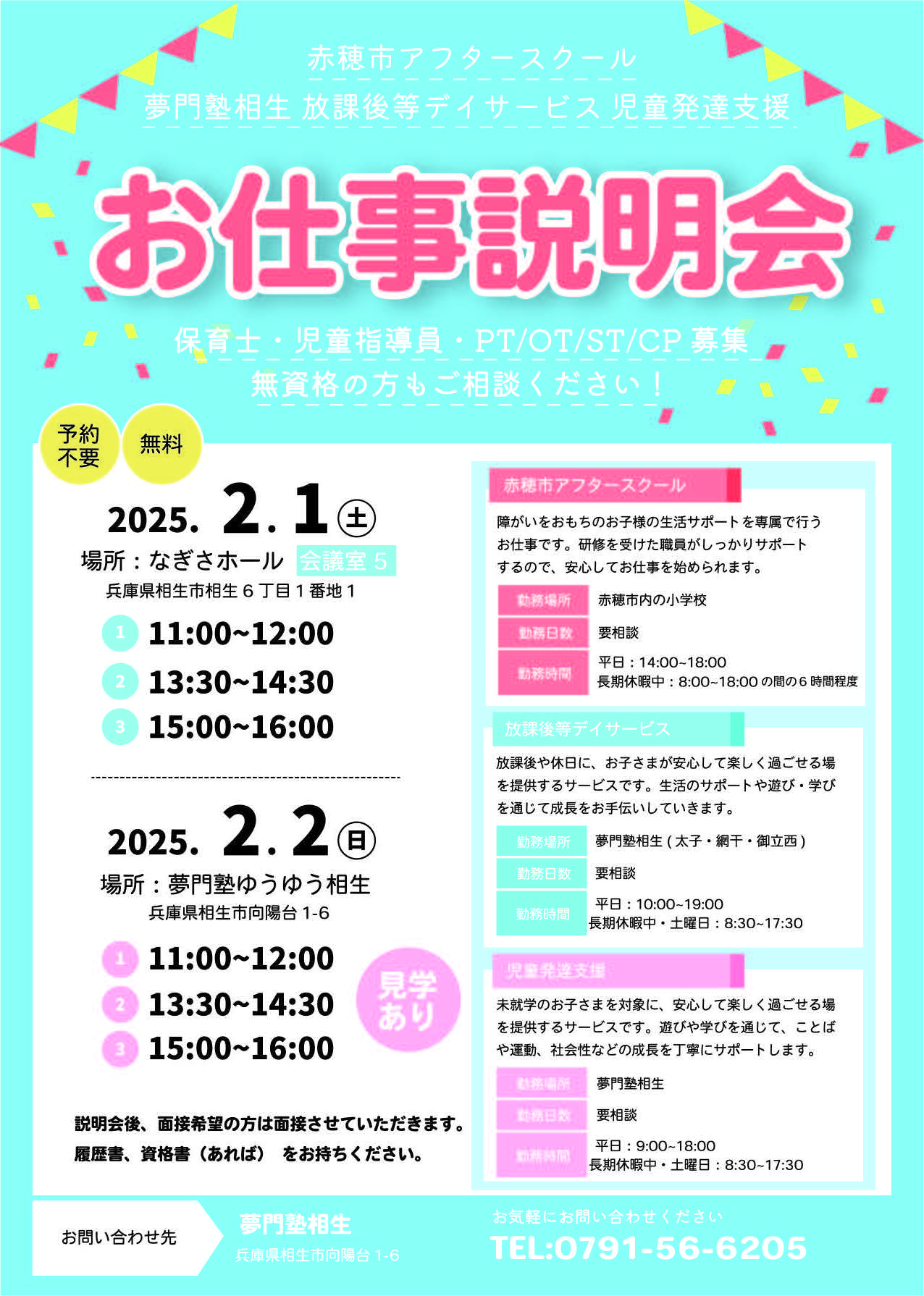 赤穂市アフタースクール・夢門塾相生(放課後等デイサービス・児童発達支援)お仕事説明会を開催します。予約不要、無料です。無資格の方もお気軽にご相談ください。