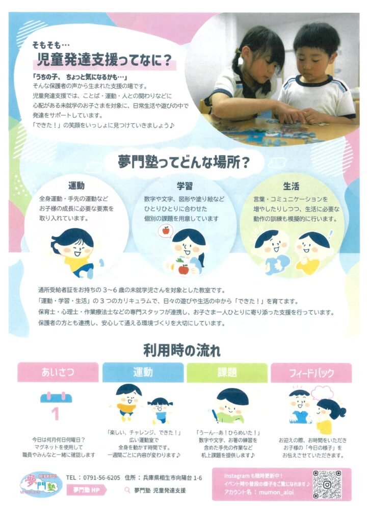 児童発達支援 夢門塾「相生」相談・体験会を開催します。参加無料です。