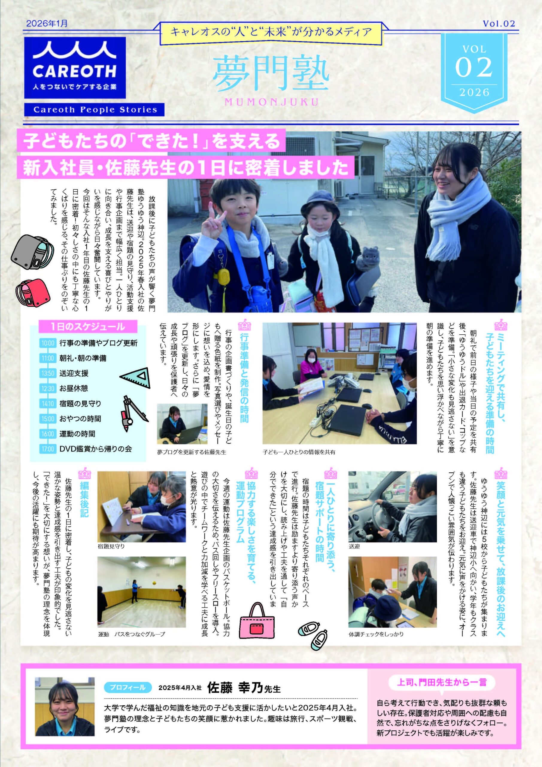 放課後に子どもたちのにぎやかな声が響く、夢門塾ゆうゆう神辺。その中に2025年春に入社したばかりの佐藤先生の姿があります。子どもたちを迎える準備に送迎、宿題の見守りや活動のサポート、子どもたち一人ひとりに合った支援、行事の企画まで毎日が新しい経験の連続。それでもひとつ一つの仕事にしっかりと向き合う姿からは、子どもたちの成長を支える喜びとやりがいが伝わってきます。今回はそんな入社1年目の佐藤先生の1日に密着! 初々しさの中にも丁寧な心くばりを感じる、その仕事ぶりをのぞいてみました。