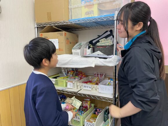 夢門塾では、子どもたちが施設内だけで使える通貨「ゆうゆうドル」でおやつを購入する、お買い物体験があります。「今日なに買う?」と友達同士で相談する姿がなんとも微笑ましい! この体験には、計算力はもちろん、欲しいもののために貯めるという計画性を育てる狙いも。楽しみながら学べる夢門塾ならではのおもしろい取り組みです。