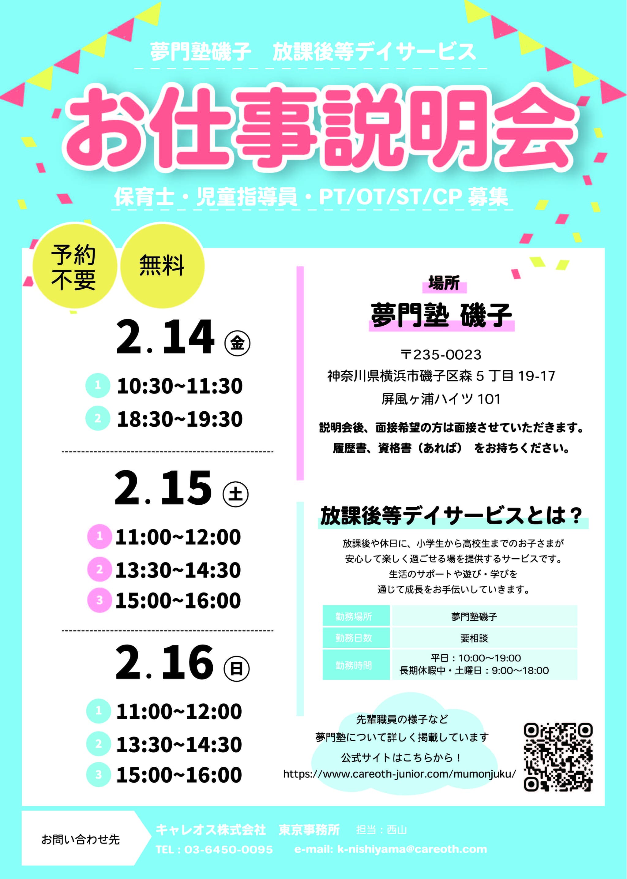 放課後等デイサービス 夢門塾磯子 お仕事説明会を開催します。予約不要、無料です。無資格の方もお気軽にご相談ください。