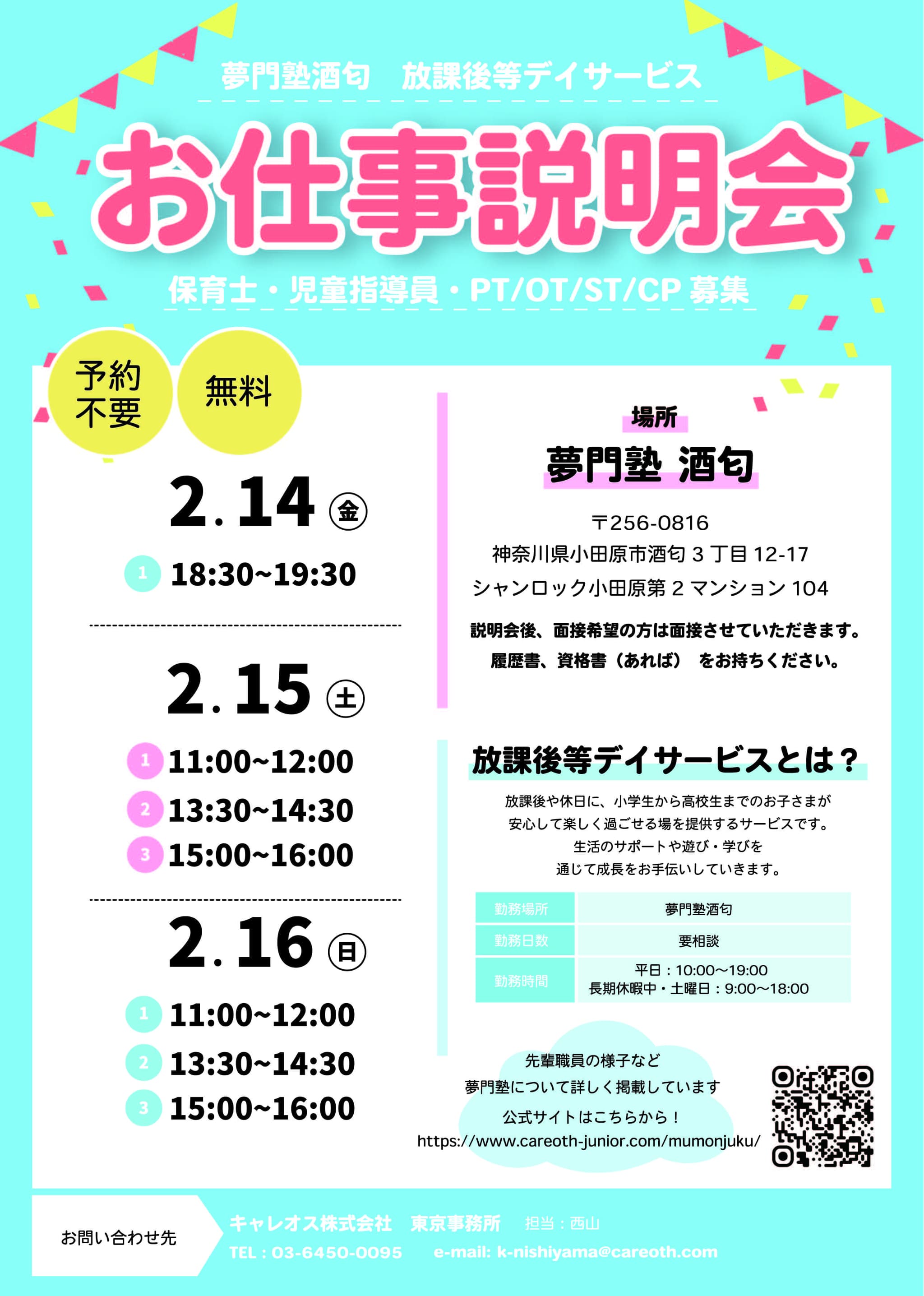 放課後等デイサービス 夢門塾酒匂 お仕事説明会を開催します。予約不要、無料です。無資格の方もお気軽にご相談ください。